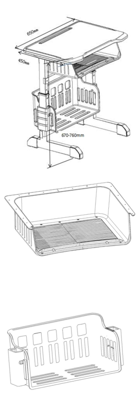 兒童課桌椅主要包括課桌和椅子兩部分,課桌主要包括桌面、書箱、置物籃、桌鋼架、腳保護套,椅子主要包括座板、鋼架、保護套。兒童課桌椅的桌面采用ABS塑料,耐沖擊性強,邊緣設計有一定的傾斜角度,可以減輕兒童在使用過程中肘部的壓力,表面采用特殊細沙皮紋設計,不反光、手感舒適。兒童課桌椅的書箱采用食品級聚丙烯材質,耐沖擊、韌性好,底部邊緣設有五角星排氣槽,具有防潮排水的功能,書箱底部設有40條細砂紋加強筋,可以增加書箱的承重能力和防滑效果。